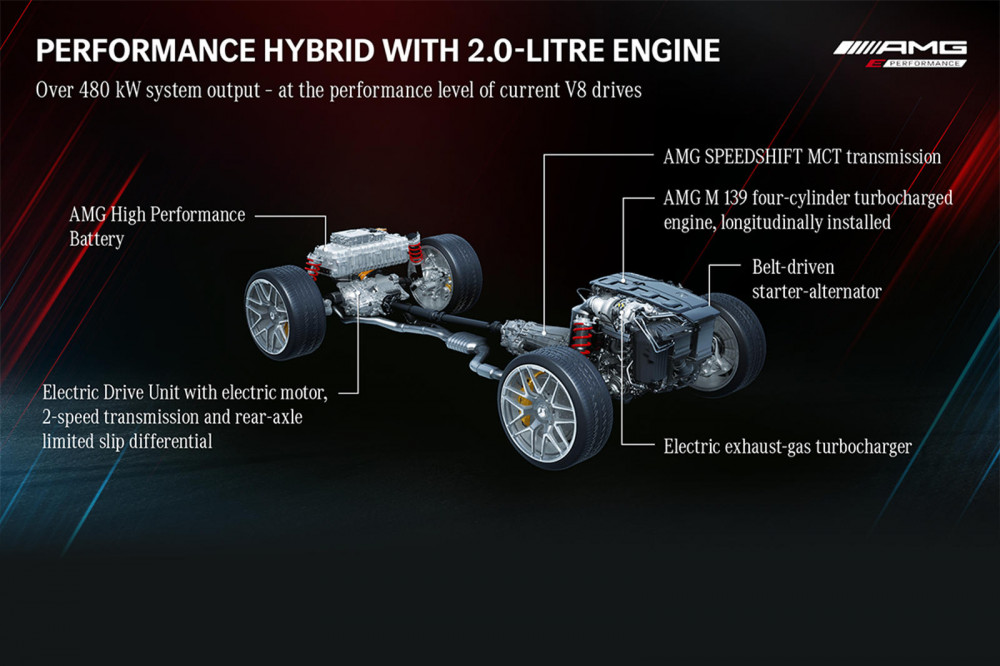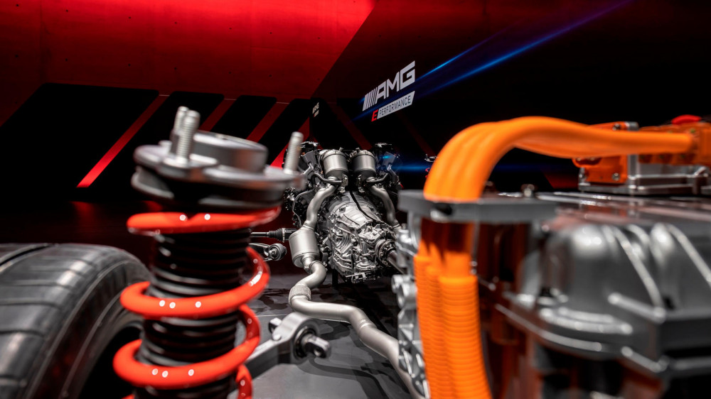 According to Mercedes, the AMG Performance Hybrid drivetrain will produce 804 hp and 738 lb-ft combined with a V8 engine. The high-performance battery is upgraded with a cooling system allowing it to give the driver a race track experience. Mercedes has envisioned a "new drive strategy" to transport their "hallmark DNA into an electrified future.
