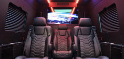 The VIP Sprinter is a mobile paradise for individuals who want the ultimate in elegance, complete with its soft, reclining leather-clad chairs, two 40-inch 4K TVs, a Sony Playstation for entertainment, and thoughtful additions like fridges.