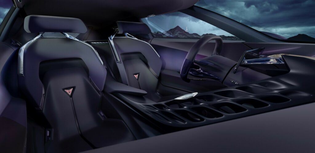 A central spine is located inside, which not only looks great but also strengthens the structure. Cupra employed environmentally friendly materials, to create seats with a sporting feel. The thermal camera on the roof, which monitors the cabin and modifies the climate control as necessary, is fascinating.