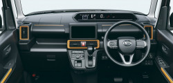 The interior of the Tanto FunCross features vibrant color elements on the dash and door cards, camouflage seat coverings, and a waterproof finish for the cargo and rear seatbacks. Both the digital instrument cluster and the 9-inch infotainment touchscreen are carried over from the standard Tanto. Camping is made simpler by features like the rear USB charging station, the additional storage beneath the boot, the interior illumination, and the add-on roof rack.