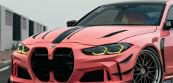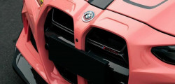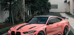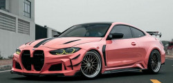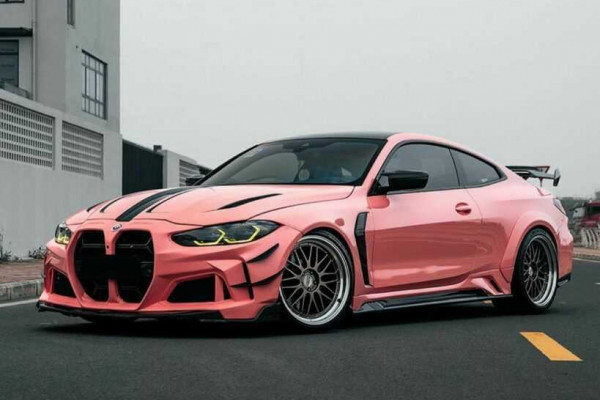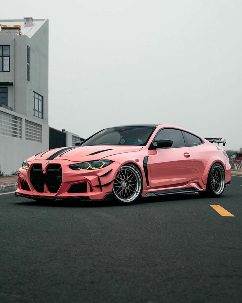 What sets this transformed BMW M4 apart is its vibrant and attention-grabbing bright pink color. However, it's worth noting that despite the striking appearance, there are noticeable imperfections in the wrap application. Large bubbles can be seen, particularly on the car's front fascia, particularly near the base of the grille, somewhat detracting from the overall finish.