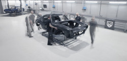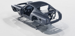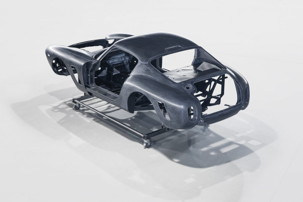 The black vehicle represents the first stage of manufacturing. A thorough chassis restoration, including powder painting, has already been completed on it. Following that is the lightweight 93.6-pound carbon-fiber two-piece body.