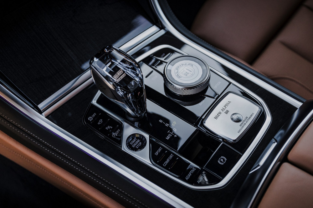 On both ends, you can spot the automaker's emblem, featuring 'Alpina' and 'B8' logos. The model's name lettering is present on the digital instrument cluster and iDrive selector with an impressive special plaque on the front and the central armrest.