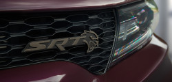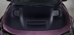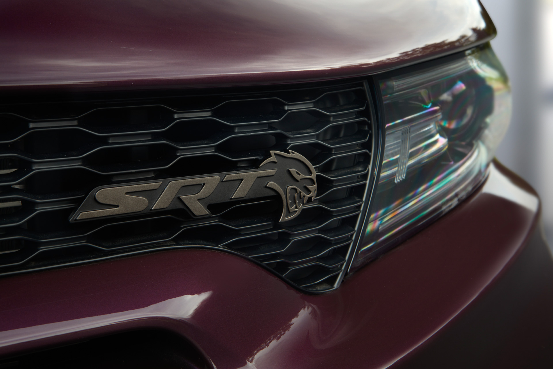 Dodge Charger is dressed in Hellraisin purple with sepia Laguna leather seats, carbon instrument bezels, and reddish brake calipers in the Brass Funky section.