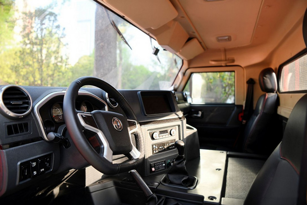 The two-seater interior has the same ultra-wide center tunnel as all Hummers, but that's where the similarities end. On the center console of the dashboard, there is an 8-inch infotainment touchscreen that is angled towards the driver. It looks more like a sophisticated SUV with silver trim on the current instrument cluster, circular temperature vents, and a four-spoke multifunction steering wheel. Dongfeng Warrior M50 is offered in two body styles: bare-chassis and pickup, but we wouldn't be shocked if a roomier wagon body style followed.