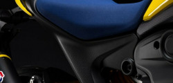 The customization of the Monster includes carbon fiber silencers, billet aluminum footrests, bespoke forged aluminum wheels, a blue seat, a one-of-a-kind plaque, and a starting animation specifically tailored to the 4.3-inch screen. A carbon-fiber mudguard set and a lithium-ion battery round out the bike's accessories. These enhancements are most likely responsible for the Senna's weight reduction of 10 pounds (4.5 kg) compared to the normal model.