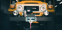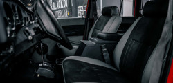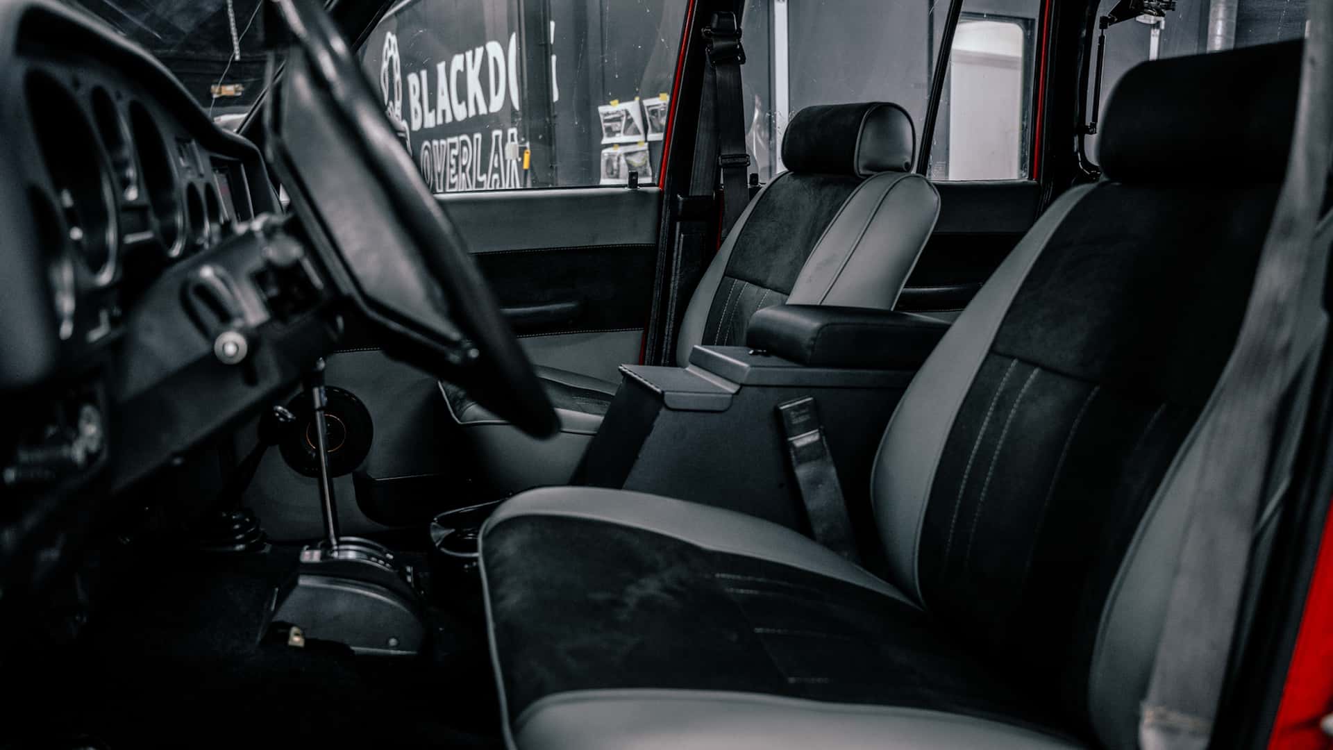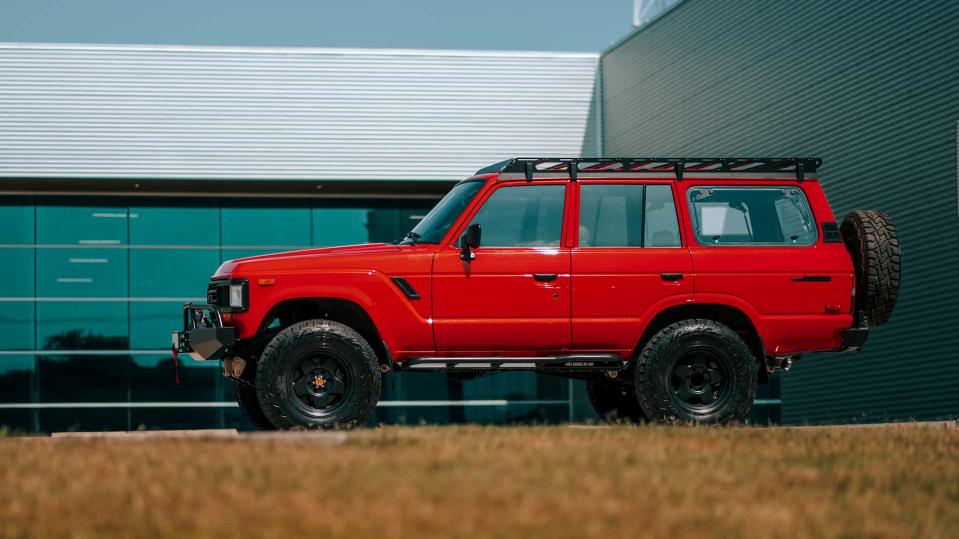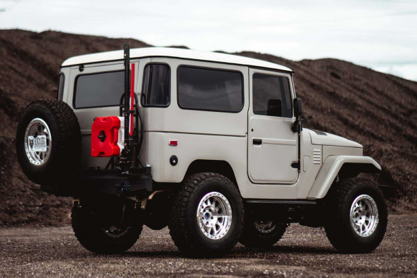 A stainless steel exhaust system, heavy-duty axles, an enhanced suspension, high-performance aluminum cooling systems, better disc brakes, and braided stainless-steel lines are some of the enhancements that the builder implements. The interior has hand-stitched leather seats and a Momo steering wheel. Additional features included in the FJ include air conditioning, a premium four-speaker sound system, Bluetooth, a backup camera, up to four USB charging outlets, an alarm system, and enhanced heat and sound insulation.