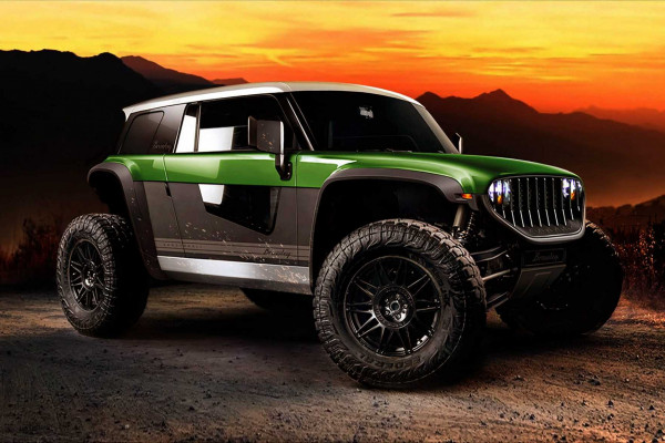 Brawley is 147.5 inches (3.75 m) long, 76 inches (1.93 m) wide, and 69.5 inches (1.76 m) tall, with a 112.5-inch wheelbase (2.86 m). The look is reminiscent of a future Jeep Wrangler merged with a Halo Warthog. Brawley shines in off-road settings thanks to its nearly non-existent overhangs, enormous 35-inch tires, 22-inch suspension travel, and 18-inch (0.46 m) ground clearance.