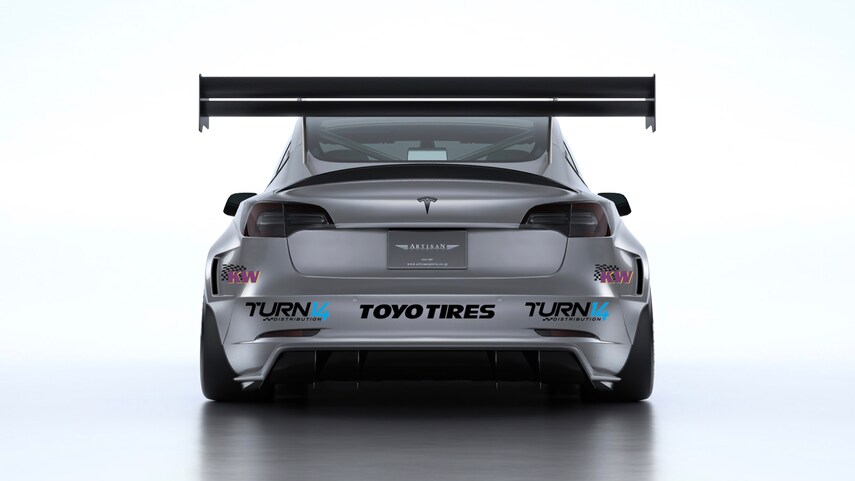 The rendering of the car consisted of increasing the width and lowering the Model 3 base around Artisan Spirits aero. Originally, the kit was designed as subtle and street-friendly, but Evasive's version points out the crazy spirit with an aggressive splitter, winglets, and vented and flared fenders upfront. The rear has a razor-sharp bumper diffuser and swan neck-style mounts that place the large, dual-plane wing just behind the car's body.