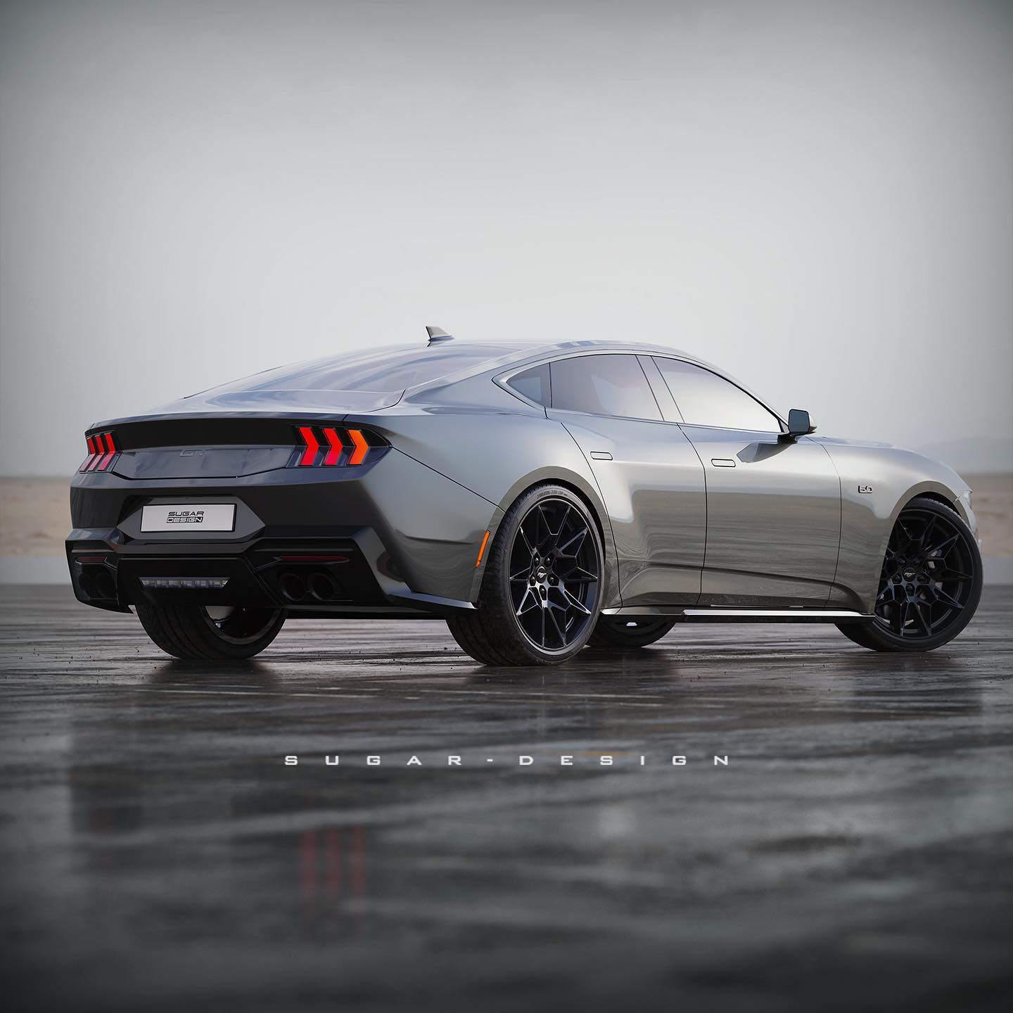 From the designer's perspective, the only noticeable differences are the reduced front doors and the pair of back doors. To further streamline the Mustang's exterior, Sugar Design substituted the original door handles. All in all, the sedan's profile is extremely reminiscent of the Mustang fastback, however, it is now a little longer and has a larger wheelbase.