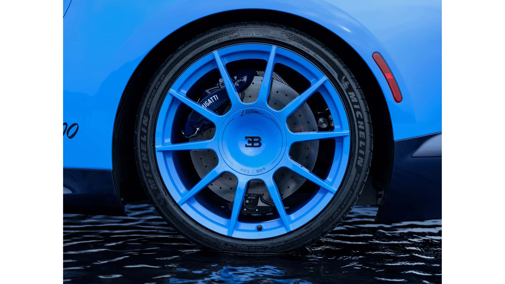 Several inscriptions embellish the last flourish: Ehra-Lessien (where it reached 304 mph), Paul Ricard (where it was tested), Geneva (where it made its debut), and Chantilly (where it was often shown). Bugatti also noted these locations to further indicate that some clients might experience the Chiron's maximum speed at Château Saint Jean and Cape Canaveral. Bugatti has hand-written "500" on the underside of the rear wing and the wheel caps to emphasize the point.