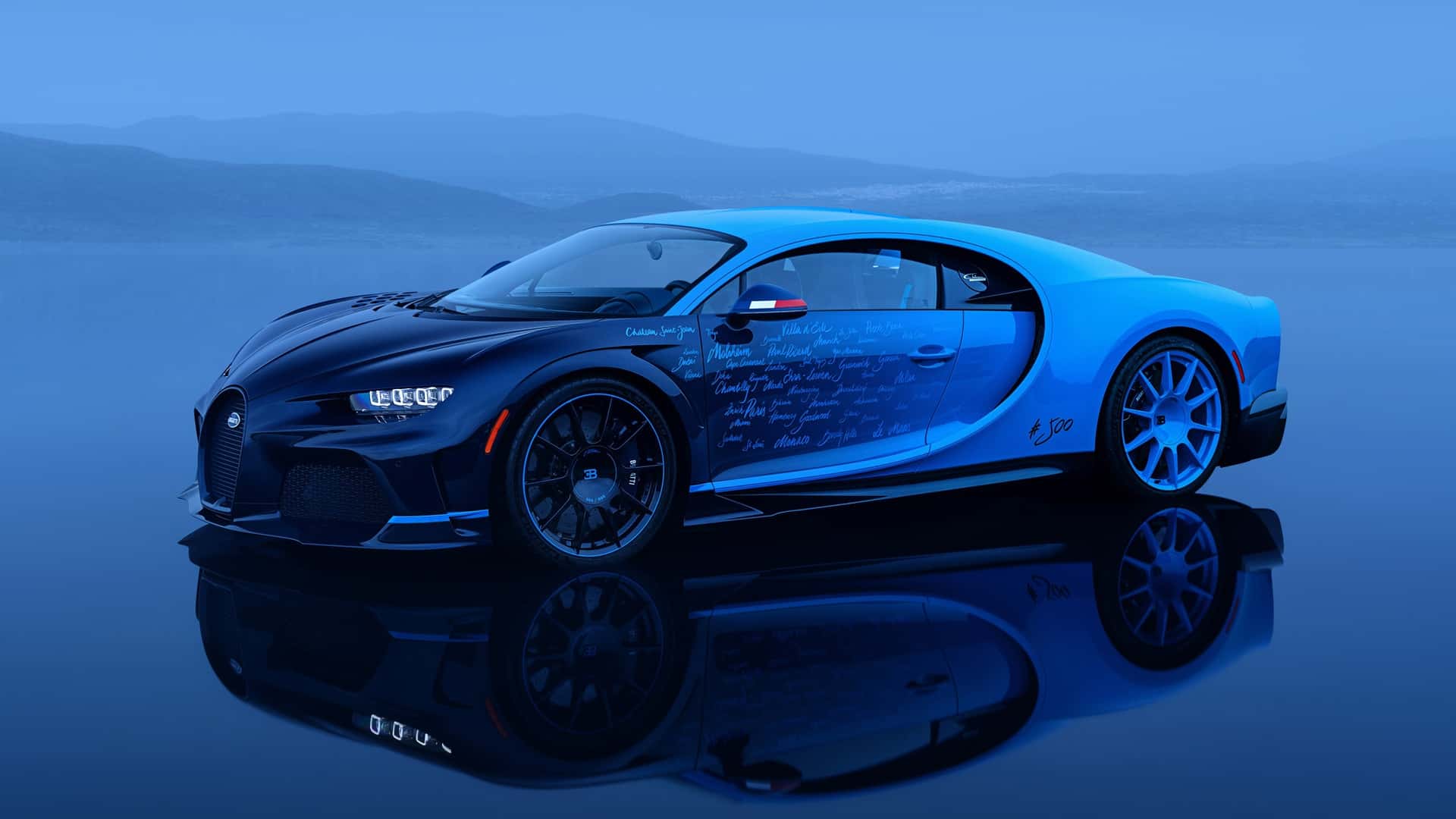 Certain photographs in the company's official portfolio truly inspired the 500th Bugatti. Eventually, the distinctive blue of the Atlantic Ocean will replace the French racing blue. In the eight years following the vehicle's inception, there are also handwritten names of significant events and locations.