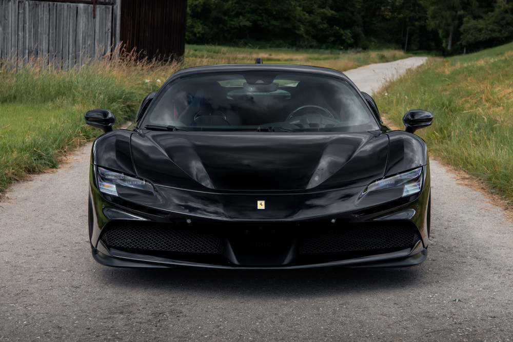 The car sits near the ground due to Novitec's new sport springs. The SF90's suspension has been reduced by 30 mm in the front and 25 mm at the rear axle, giving it a more aggressive posture.