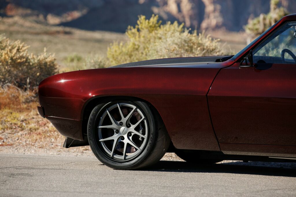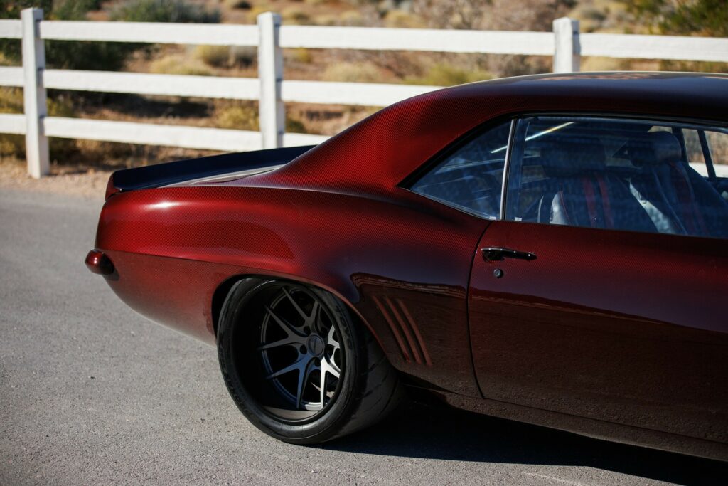 Finale Speed has just unveiled its latest project, a 1969 Chevrolet Camaro showcased at the SEMA Show. What makes this Camaro truly stand out is its stunning carbon fiber exterior. Finale Speed went the extra mile by crafting an entirely new carbon fiber body for this classic muscle car, meticulously priming and painting it with a custom-mixed BASF Candy Red finish.