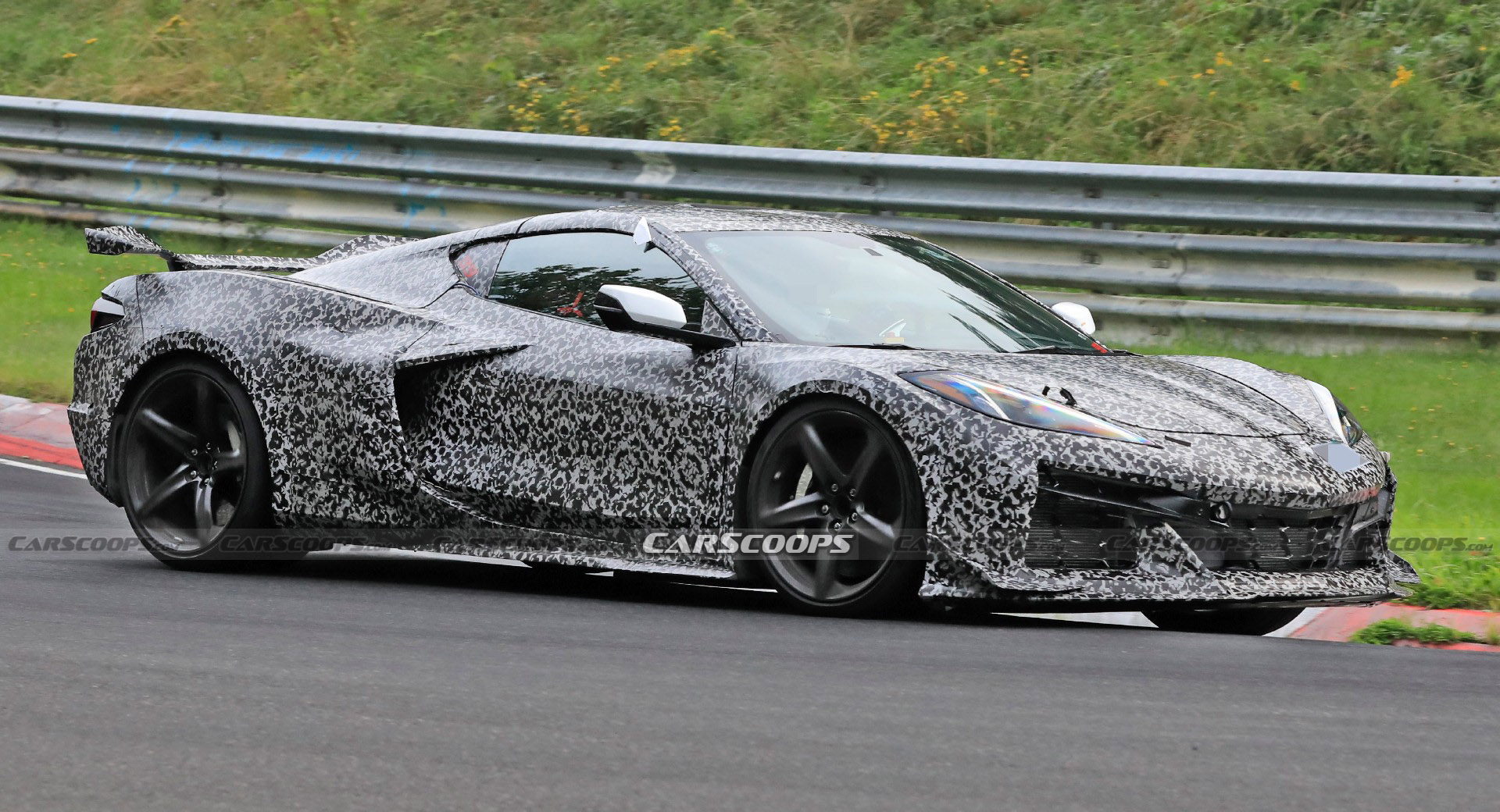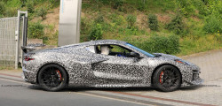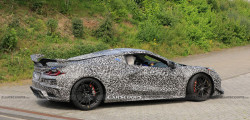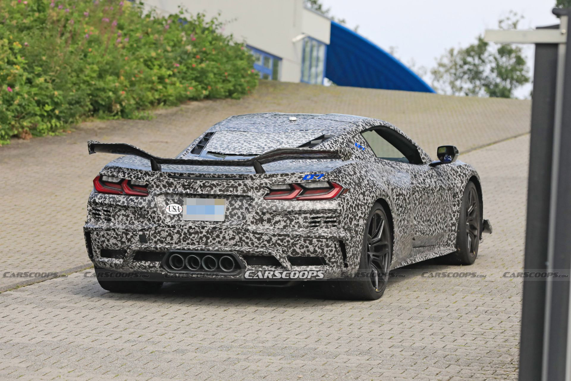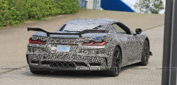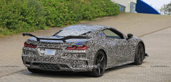Designs of the Z06 with two distinct styles of rear spoilers have been spotted at the Nürburgring in recent months. The disguised Corvette in Chevrolet's official teaser clip bears a resemblance to those versions, with the quadruple exhaust pipes emitting a distinctive V8 sound.