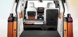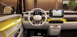 The van's body will be offered in 11 different colors. There are 7 single-color variants and 4 two-tone possibilities, similar to the original T1. A 10-inch infotainment screen is combined with a 10-inch gauge cluster display, and a stalk fitted to the steering wheel switches between Drive, Neutral, and Reverse. In Europe, a 12-inch infotainment screen with navigation is offered as an extra.