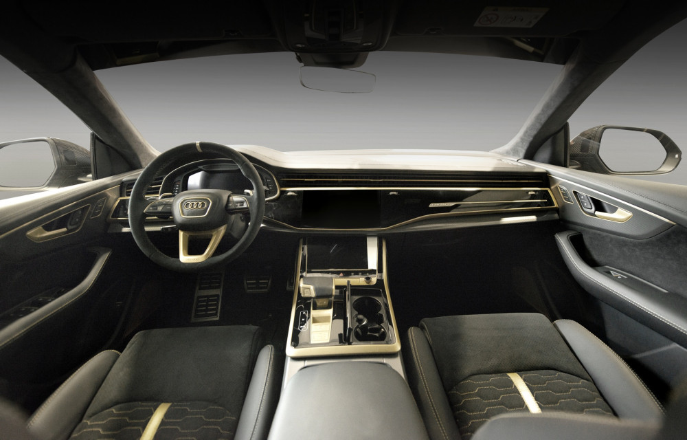 The RQ 900 is far less smooth in appearance than the basic RS Q8. The gold designs contrast with the black tone and blacked-up accents all around the body. Wider fenders, a front splitter, side skirts, a double rear spoiler, and a more pronounced diffuser are among the new features. Active valves and four 100 mm tailpipes with ceramic or carbon coating are included in the new stainless steel exhaust system.