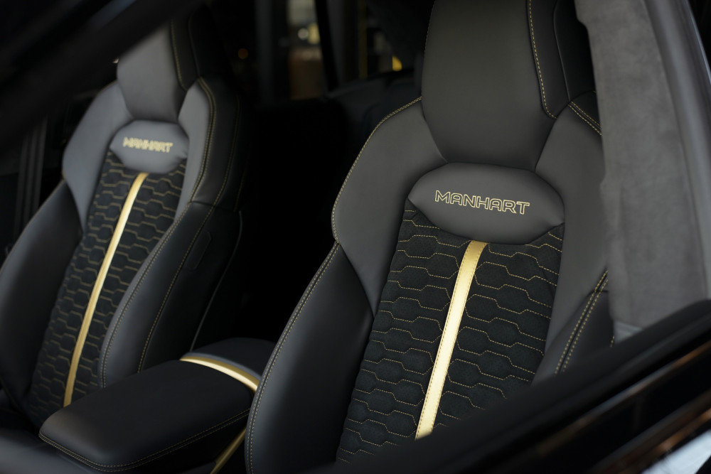 The dashboard, center console, doors, and steering wheel all have golden accents to match the outside graphics. Manhart put their own floor mats and fresh leather upholstery throughout the interior with ornamental stitching.
