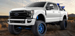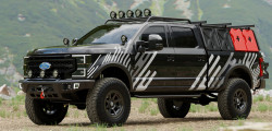 The Air Design Maverick takes a somewhat different approach, with a 1.5-inch raise kit and 18-inch wheels encased in 31-inch all-terrain tires giving it a tough character. Air Design USA fender flares, door moldings, and a tailgate inlay have also been installed to the vehicle. A bed cap and the stock FX4 Off-Road Kit make the perfect combo.