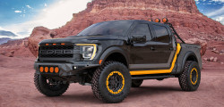 Desert Designs' F-150 Raptor is likewise worthy of your attention. Custom graphics, as well as beefy tires encased in Beadlock wheels, have provided it a subtle upgrade. Addictive Desert Designs bumpers, rock sliders, and a bed-mounted tire rack are among the other attractions.