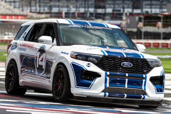 The variant has a white body with distinctive blue racing stripes intended to promote the Ford Performance Racing School. Explorer has also had a front splitter, window nets, and 21-inch signature wheels clothed with tires from Michelin Pilot Sport Cup 2.