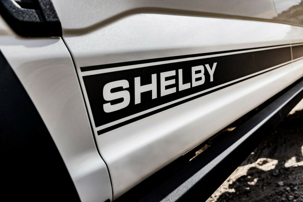 The F-250 Super Baja also comes with robust bumpers, painted fender flares, a Shelby-branded grille, auxiliary lights, power side steps, and a functional air induction hood with an extraction vent. It features stripes, a bed liner, and a chase rack with two spare tires.