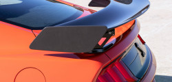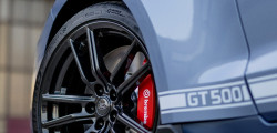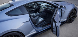 The model's exterior is a distinctive Brittany Blue with two separate Wimbledon White stripe variations, so there aren't many changes. The first includes painted racing stripes and a one-of-a-kind GT500 emblem, while the second has vinyl racing stripes and lateral stripes.