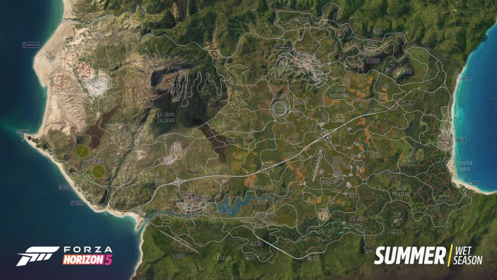 Forza Horizon 5's complete map has now been published, ahead of the open-world racing game's November 9 release. Mexico's map is 50 % wider than Forza Horizon 4's, and it includes a tunnel system under the major city, numerous runways, and a huge volcano with a tight and curvy road leading to the peak. There will be a big variety of dirt and paved roads as well.