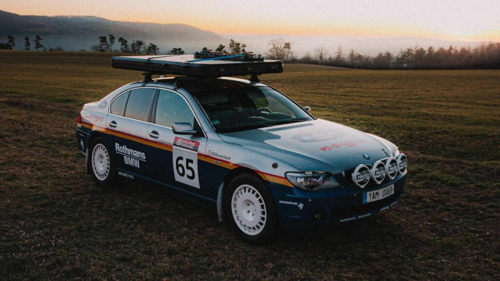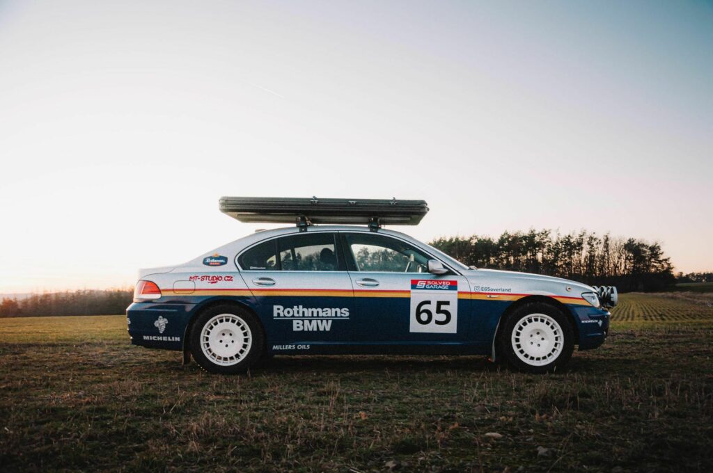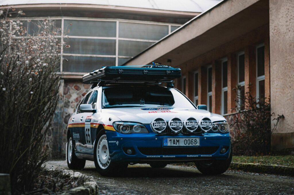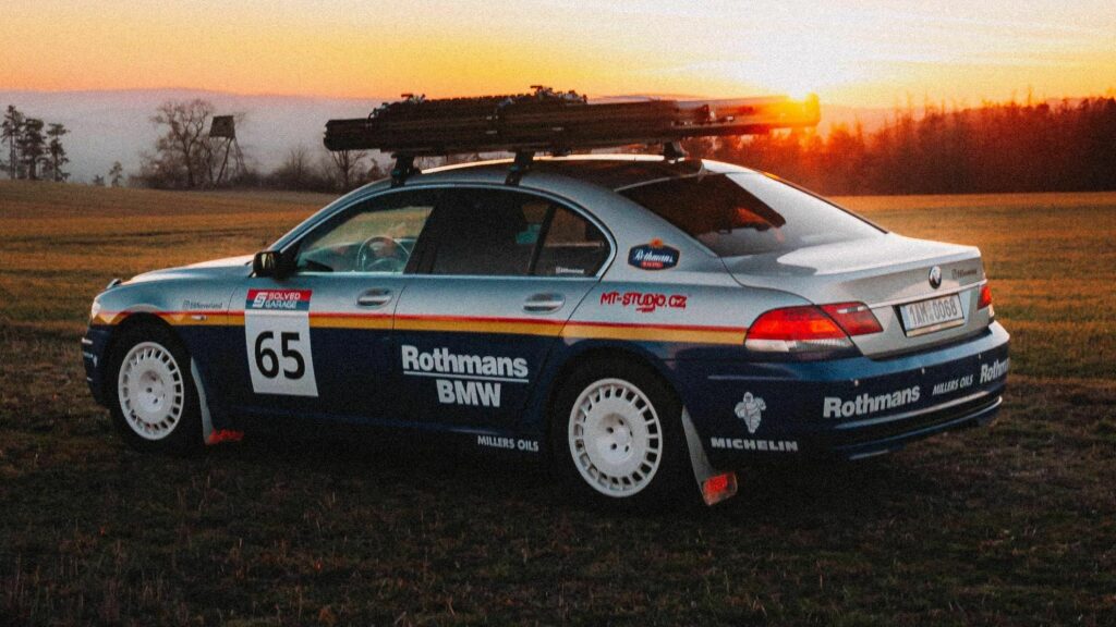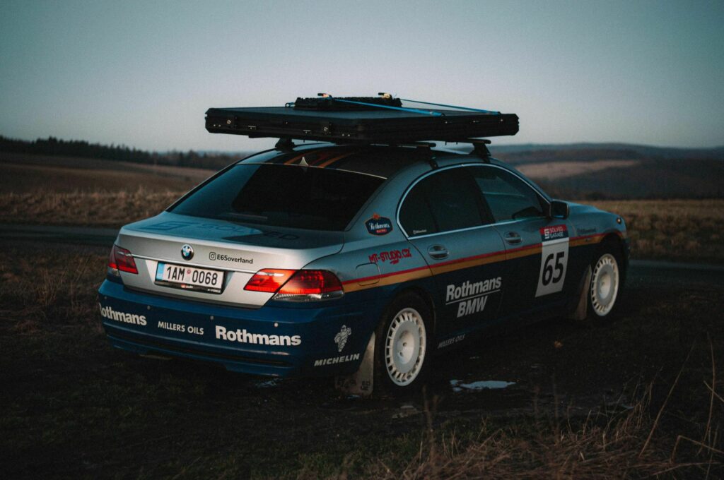 With its classic Rothmans livery, blending blue and silver tones with yellow and red graphics, the tuned E65 stands out from any other 7-Series. The inclusion of a roof tent and four more headlights placed in front of the kidney grille are two more visually noticeable changes. Furthermore, the daring BMW is equipped with a fresh set of rally-inspired alloy wheels that are shod with dependable Yokohama Geolander rubber.