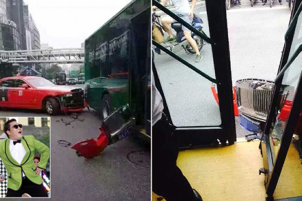 There were no injuries, when the red Rolls bumped into a bus and Psy reportedly settled the matter privately. It happened in a city in Eastern China. The bus only sustained about $300 in damage, but the Rolls is a different matter. About $112,000 to get it repaired, the price you pay when you roll around in luxury like that and make a mistake!