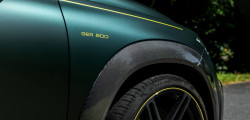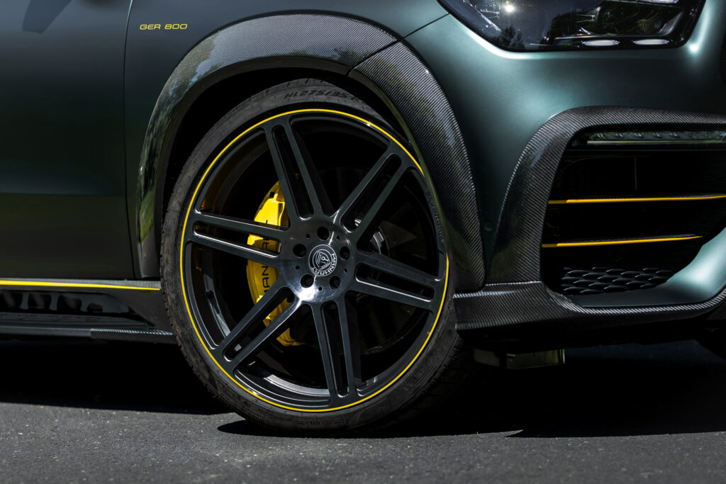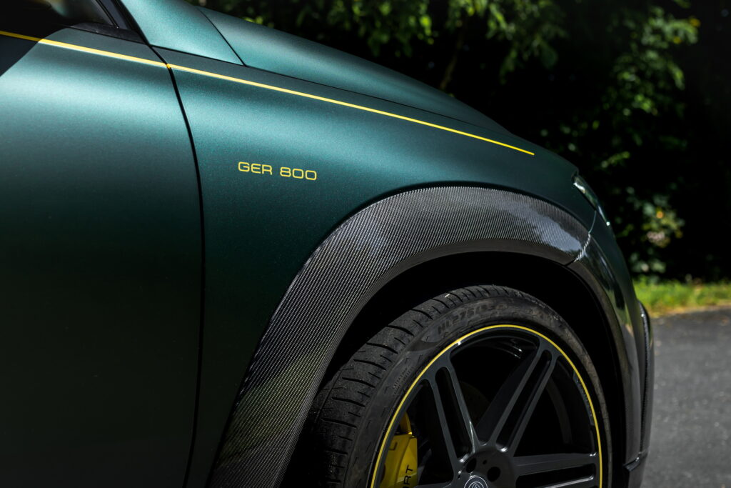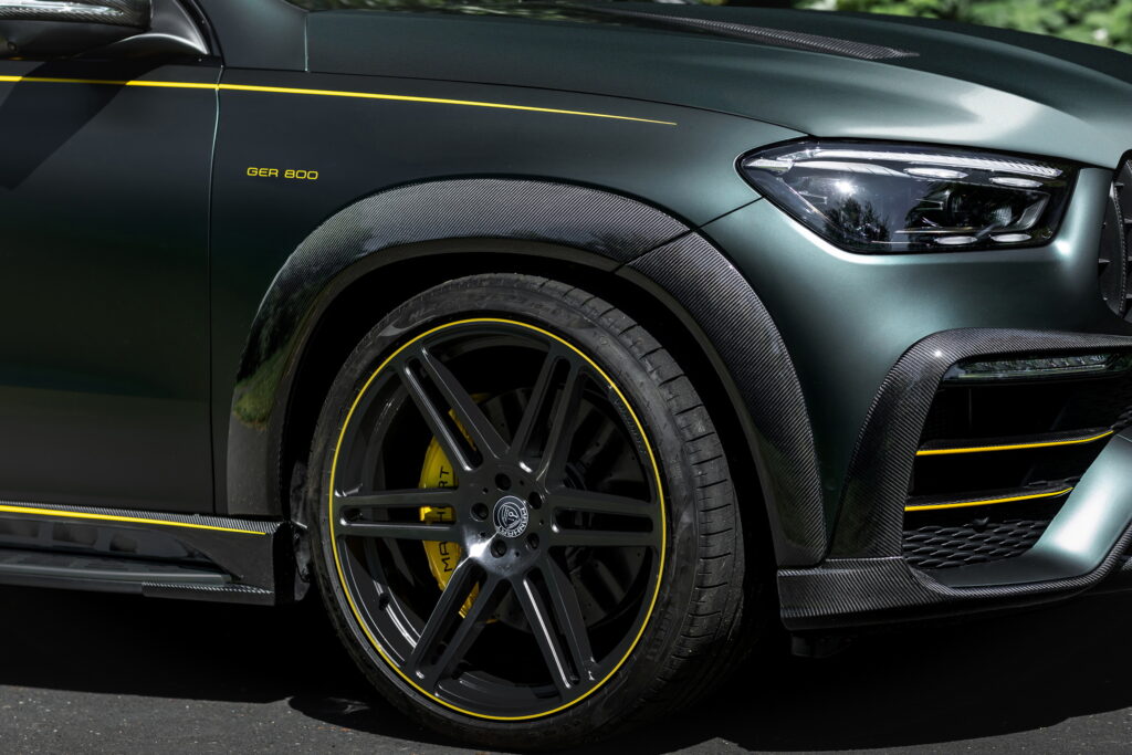 Manhart customized their exhibition car with a set of bright yellow decals that stood out against the matte, dark green paint and exposed carbon fiber. Modern 23-inch Manhart Concave One alloy wheels with a satin black coating and yellow accent strips are mounted on the GER 800. The front tires are 285/35ZR23, while the rear tires are 325/30ZR23.