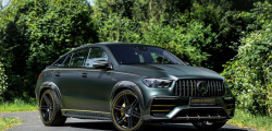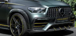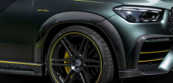 Carbon fiber parts adorn the GLE's exterior, including broad fender extensions and bumper inserts that match the bodywork. A vented hood and an expanded ducktail spoiler are further features that enhance the car.