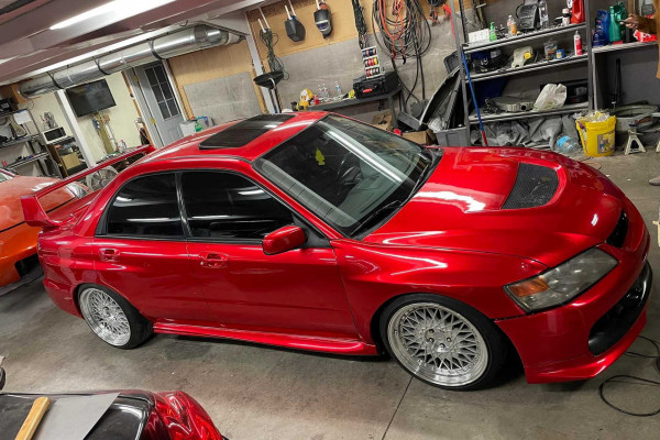 The car is practically finished, except for the intercooler and front grille, which require some attention. Jonah chose a metallic Soul Red wrap, which is more appropriate for the Mitsubishi. He also went for a new set of BBS-style rims that fill out the wheel arches beautifully.