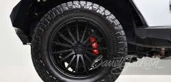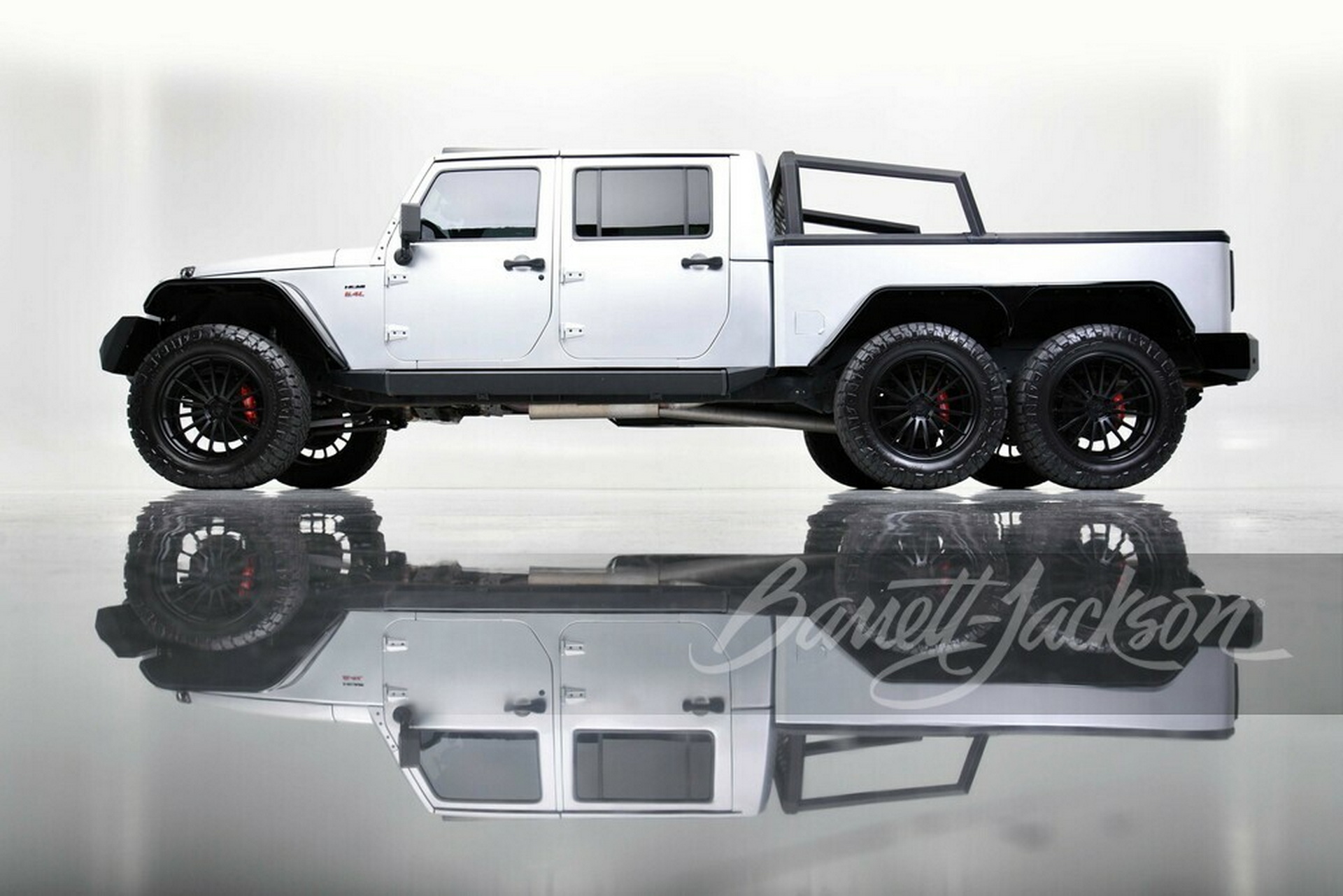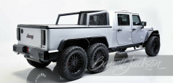 This Jeep Wrangler 6x6 also features handmade Borla headers, an updated suspension for smoother riding, and two gas tanks. It rides on 22-inch wheels with Nitto Ridge Grappler 37-inch tires wrapped around them and Wilwood power disc brakes.
