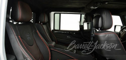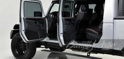 It's a Mercedes-Benz Silver paint job on this Jeep Wrangler 6x6. Full-size back doors are unique, as are the 200 lbs (91 kg) aluminum grille, the LED headlights, the smoky LED taillights, and the bespoke bumpers with Rigid LED lights all over the vehicle.