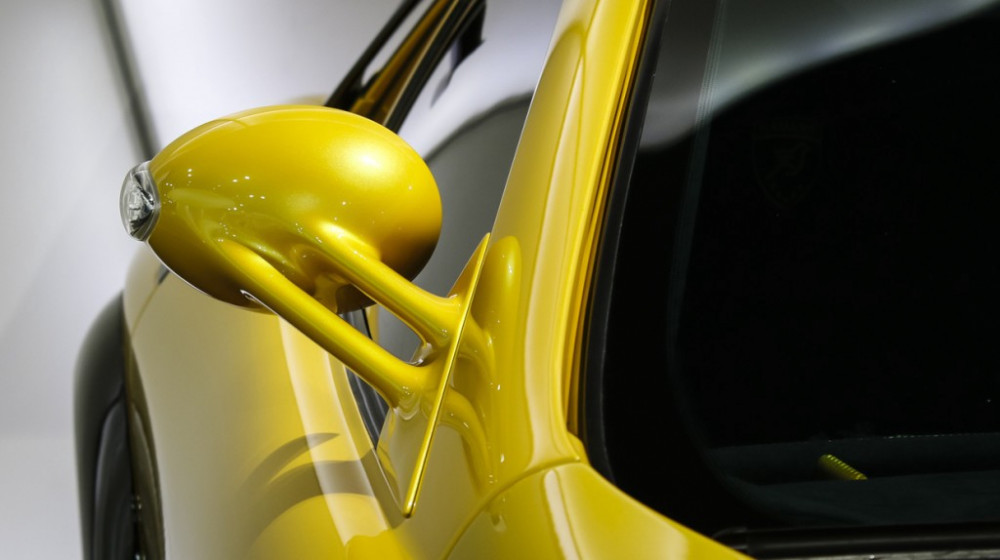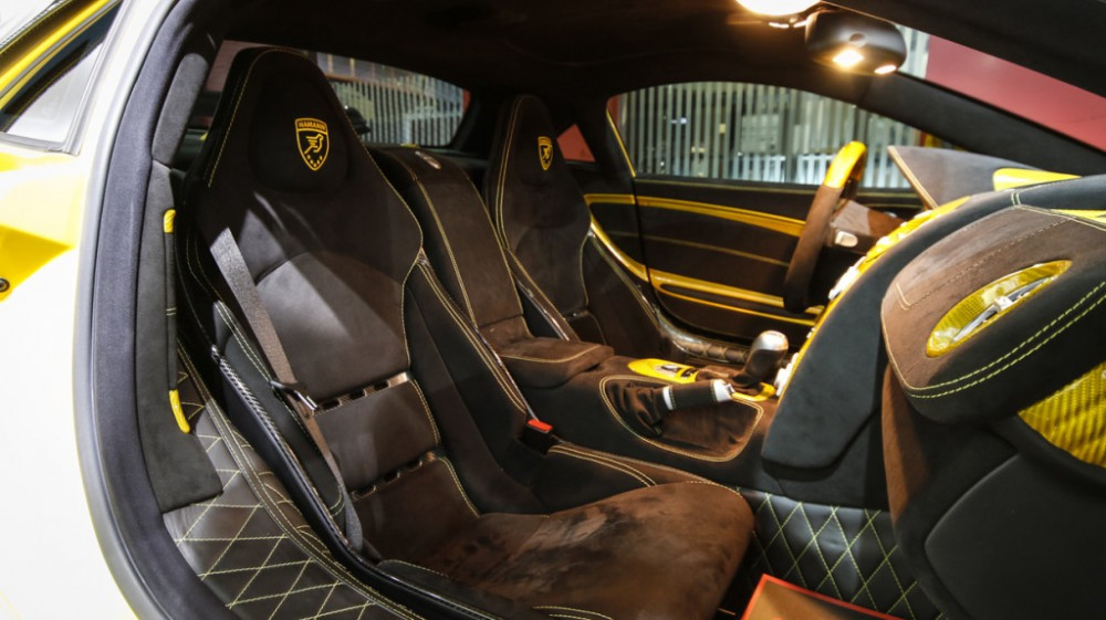 The front features a carbon fiber splitter, custom hood with glossy carbon fiber. The interior got racing seats in black Alcantara leather with yellow stitching and yellow carbon fiber elements.