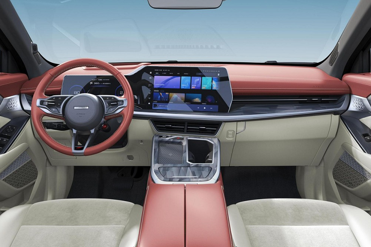 The Shenshou's dramatic design extends inside, with a 12.3-inch digital instrument cluster and a massive 14.6-inch infotainment display. Apart from the wheel and door panels, there's a Qi wireless phone charger, a slick center console, a three-spoke steering wheel, and an almost total lack of buttons.