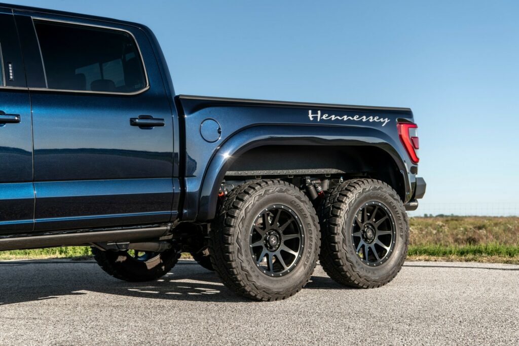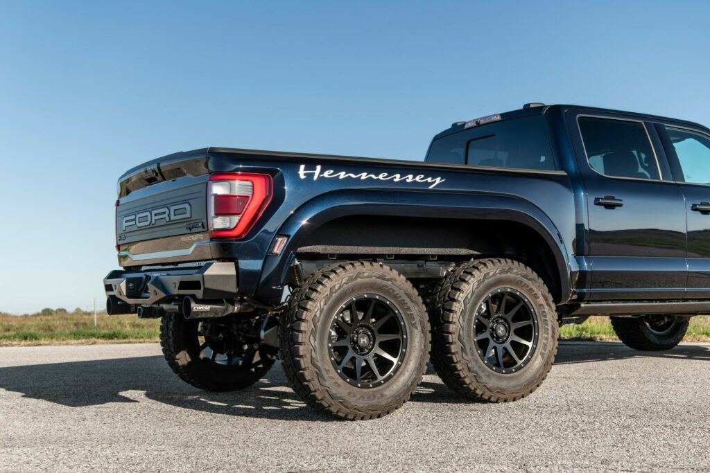 First of all, Hennessey has elongated the frame and introduced a second locking rear axle, claiming it enhances traction by over 50% compared to a standard F-150 Raptor R. The tuner has also outfitted the 6×6 with Fox Live Valve shock absorbers and elevated the ride height by three inches. Custom 20-inch alloy wheels shod with 37-inch off-road tires.