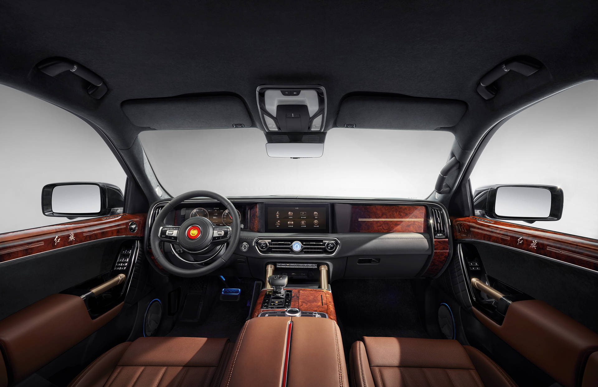 The steering wheel is plainly influenced by Rolls-Royce, and the wood on the dash, center console, and doors is the real show-stopper. For a rich ambiance, it is mixed with gold trim and leather upholstery. The Hongqi LS7 has auto climate control, dual displays on the dash, and a set of screens for the back seats.