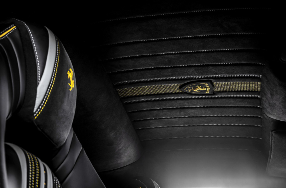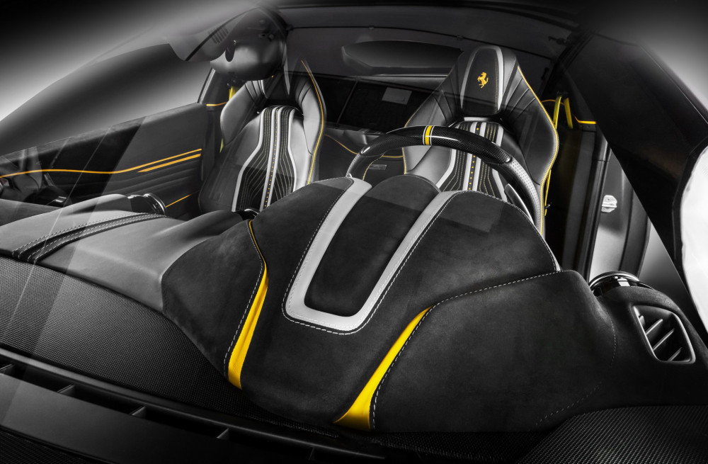 The tuner explored the interior according to the owner's demands and opted for black as the dominant color. Upholstered in leather and Alcantara combination, you'll see the grey accents on some parts of the seats and dashboard. For a striking contrast, Carlex opted for the bright yellow on the seat beads, stitching, and piping, on the door cards, center console, dashboard, and steering wheel. The headliner also features yellow accents but is also a custom-made piece, especially for this makeover. The tuned Ferrari features also a carbon fiber trim, new floor mats, along a unique plaque in the area behind the seats.
