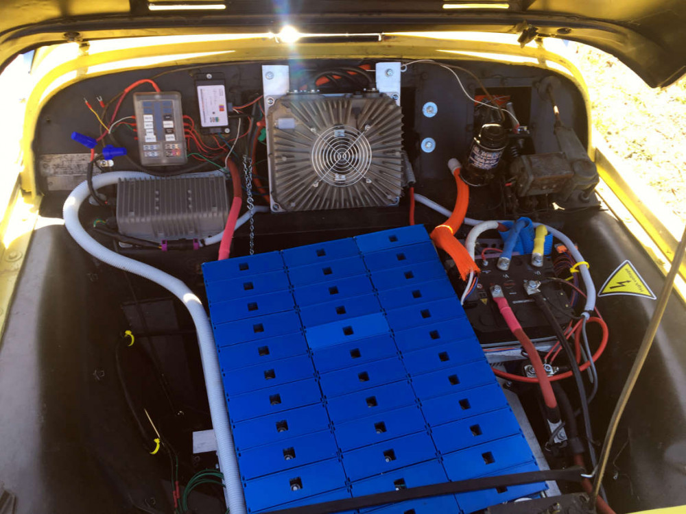 One or two days per week and in six months the TR# EV was ready. It took a lot of EV shopping from different destinations, but they managed to piece together a 21 battery pack and a DC-DC converter (a necessary piece for powering from the 12V wiring).