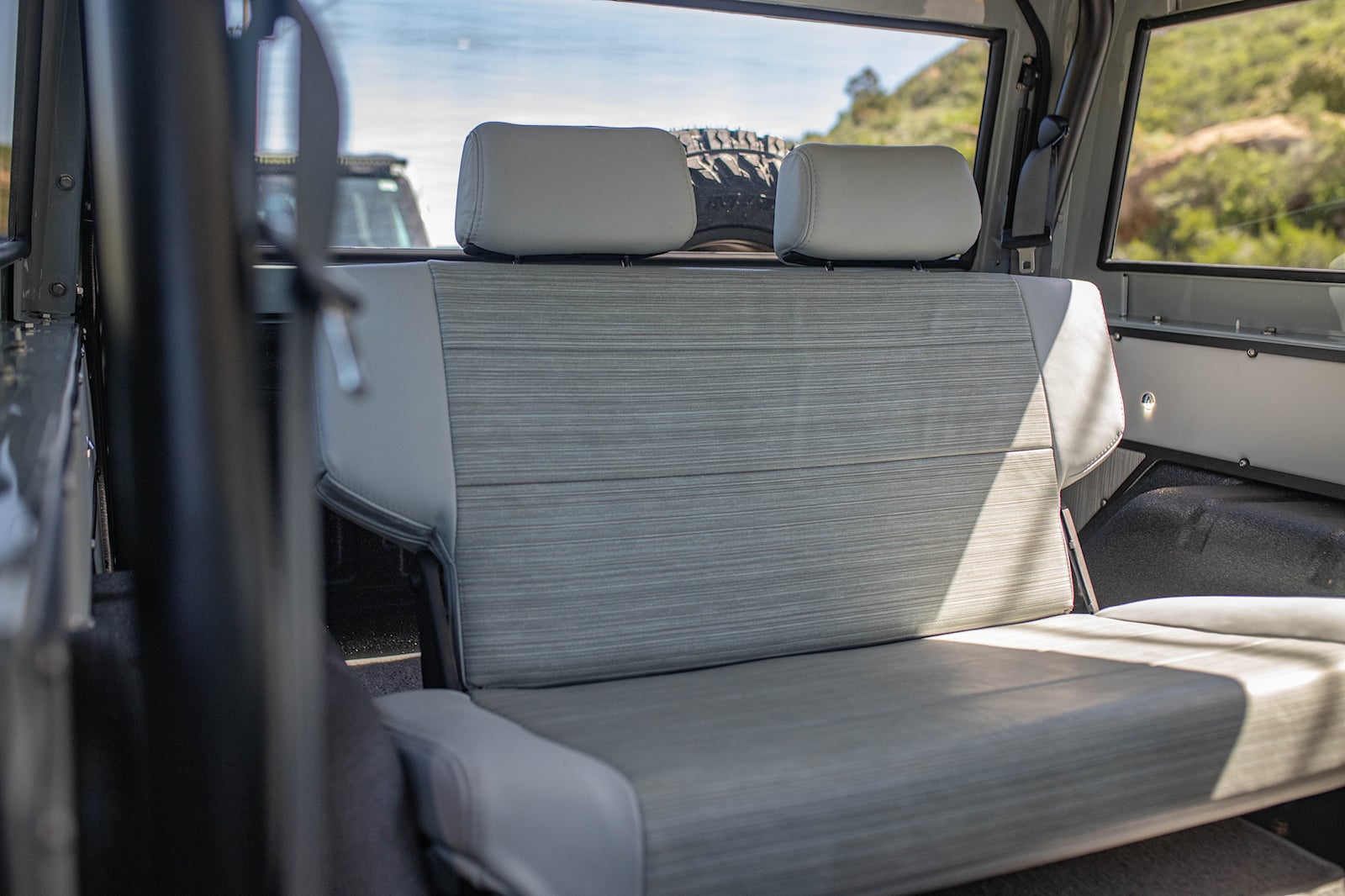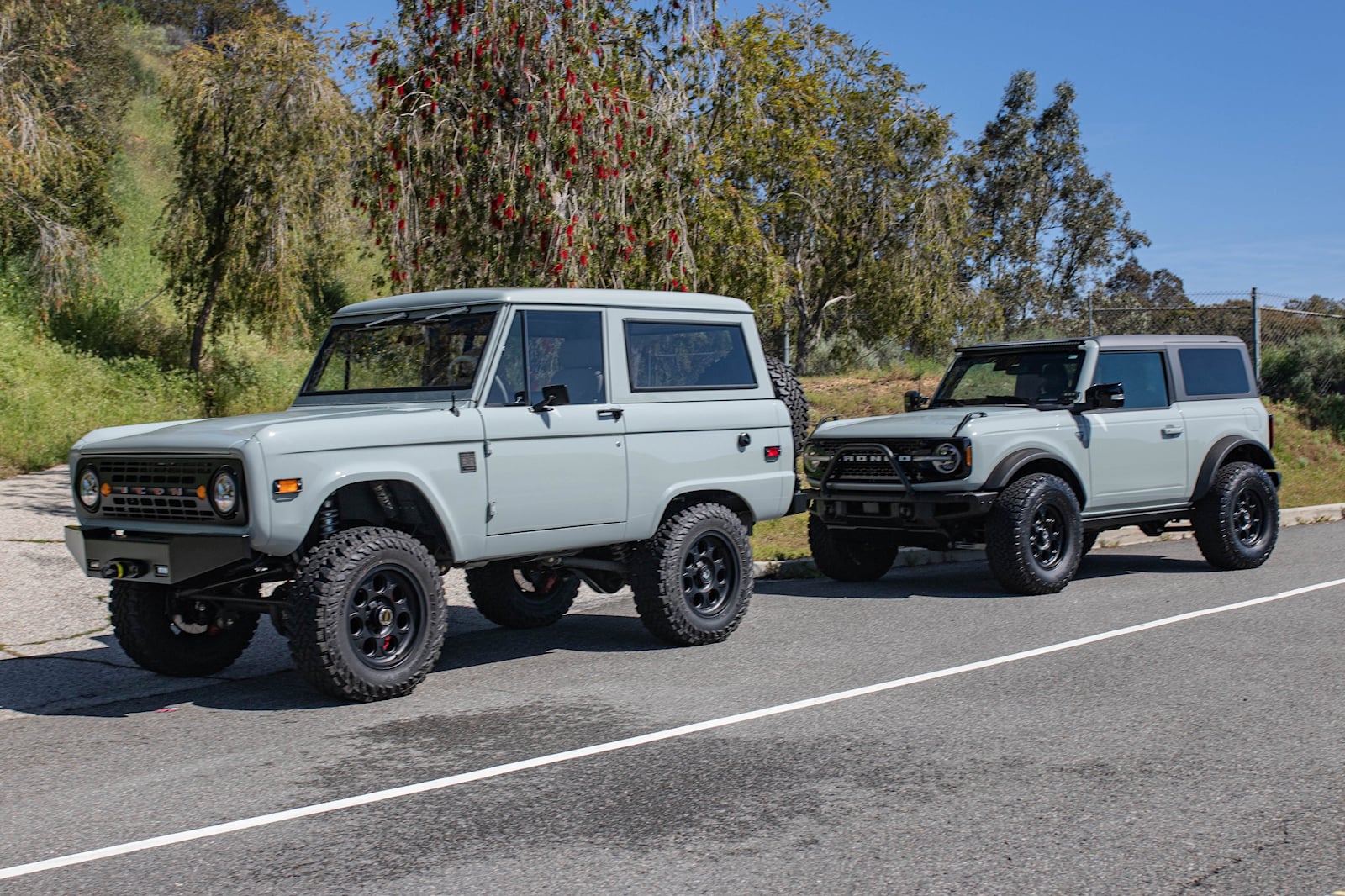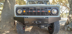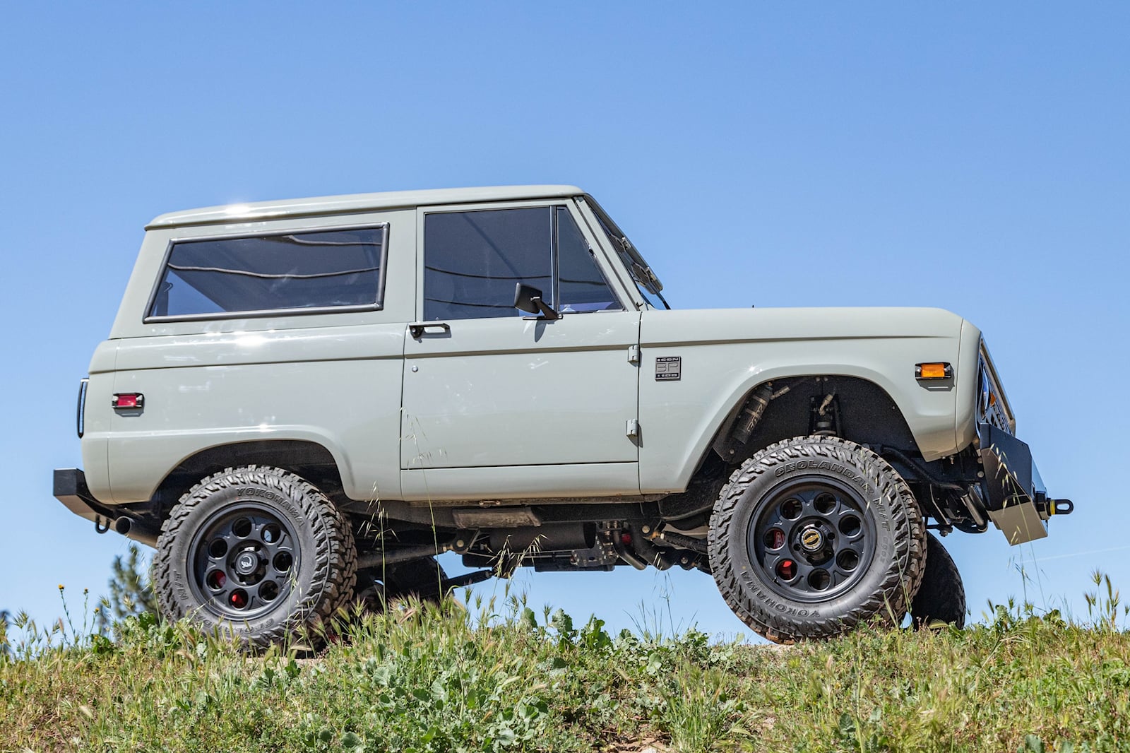 Let's get down to brass tacks. The Icon Bronco 100 has adjustable sway bars and coil springs from Eibach, sport brakes from Brembo, and air-locking differentials from ARB. Icon chose the contemporary Bronco's signature Cactus Gray for the exterior. It pairs wonderfully with the rest of the exterior, which is coated in Icon's Volcanic Black. Icon's New School custom wheels are the icing on the cake.