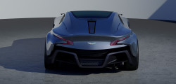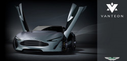Despite its electric engines, the Vanteon has the typical front-engine, two-door Grand Tourer design, with a tall hood, short back decklid, and low roof. The distinctive Aston Martin grille and muscular, tinted headlamps immediately draw attention to the front end. There's also a noticeable power bulge on the bonnet.