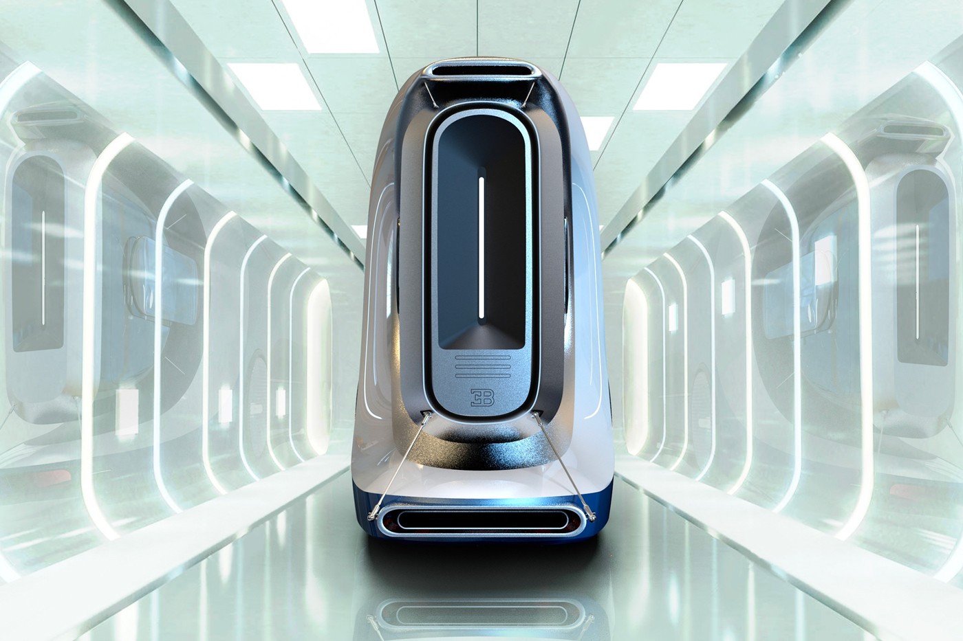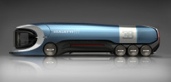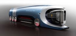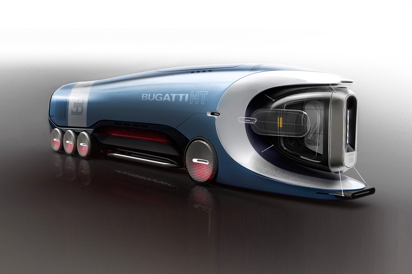 The vehicle's front end is shaped like a "C," one of Bugatti's signature design lines, and has a single-passenger cab that places the driver in the center.