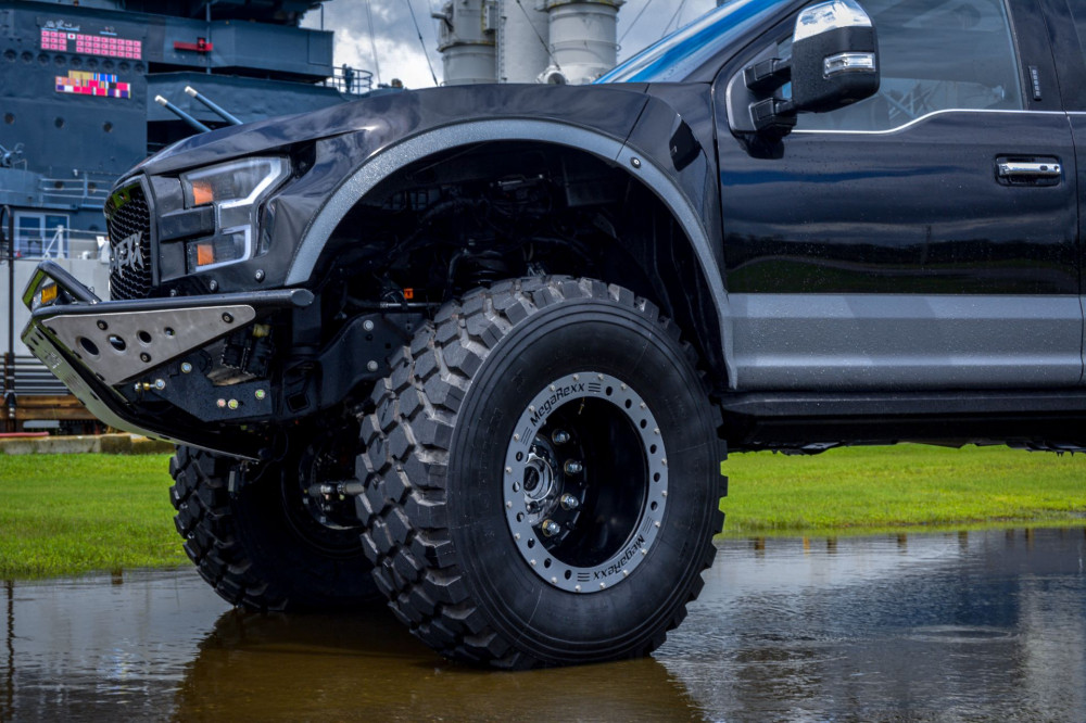 MegaRaptor takes the Super Duty to new heights due to its jacked-up air suspension and large wheels, a set of “Mine-Resistant Ambush Protected” aluminum rims estimated at 10,000 lbs each for and covered in massive Michelin XZL tires size 46′′x15.5′′ (395/85R20).