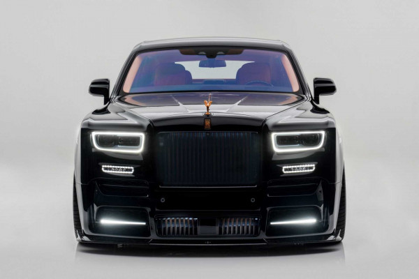 A custom front bumper with bigger intakes, extra LED DRLs, and a carbon fiber splitter are just a few of the Mansory touches added to the Rolls-Royce Phantom. The orange glow complements the Spirit of Ecstacy, and the RR logo, while the rest of the bodywork is all-black.