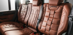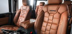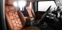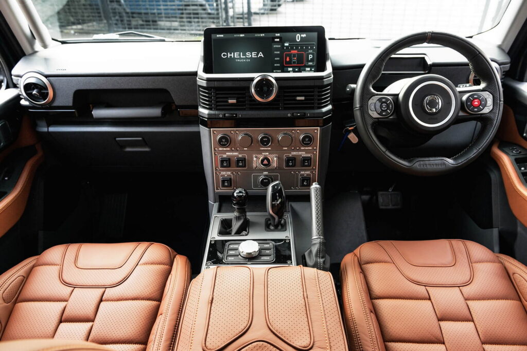 The Chelsea Truck Company's Grenadiers will showcase their retrimmed cabin until they release a more extensive style kit. The three-dimensional perforated pattern on the tan leather re-upholsters the factory-fit Recaro seats, elevating the cabin's opulence to new heights.