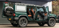 The only external aftermarket components visible are the widened wheel arches, which accommodate larger tires, and the gloss black spare wheel cover fitted on the tailgate. The alternative Grenadier models featured a front grille reminiscent of the Dakar and broader fender extensions.