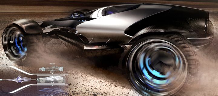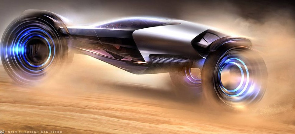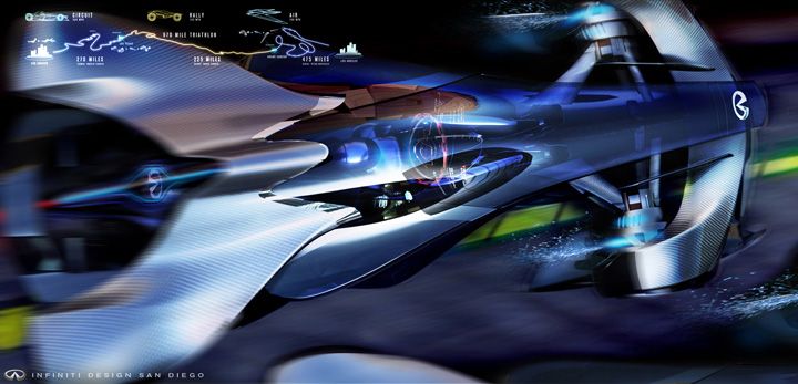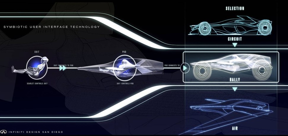n addition to the Human - Machine Interface, the Infiniti Synaptic offers three protective shell options: one that is very much like Formula 1 race cars, one for having fun in the sand dunes, and one that can fly.