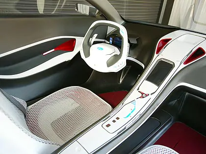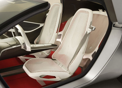 Ford Reflex concept: The modern, inviting interior of the Ford REFLEX concept features lightweight inner seat frames wrapped in mesh. The white mesh fabric is offset with warm red carpeting. Reverse butterfly doors provide easy ingress and egress for the Ford REFLEX concept. An innovative second-row 'love seat' accommodates one adult, or can be divided to accommodate two smaller children.